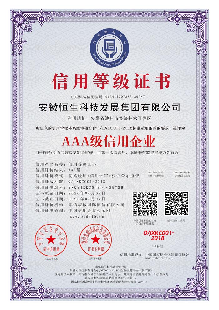 信用等級(jí)認(rèn)證證書AAA級(jí)